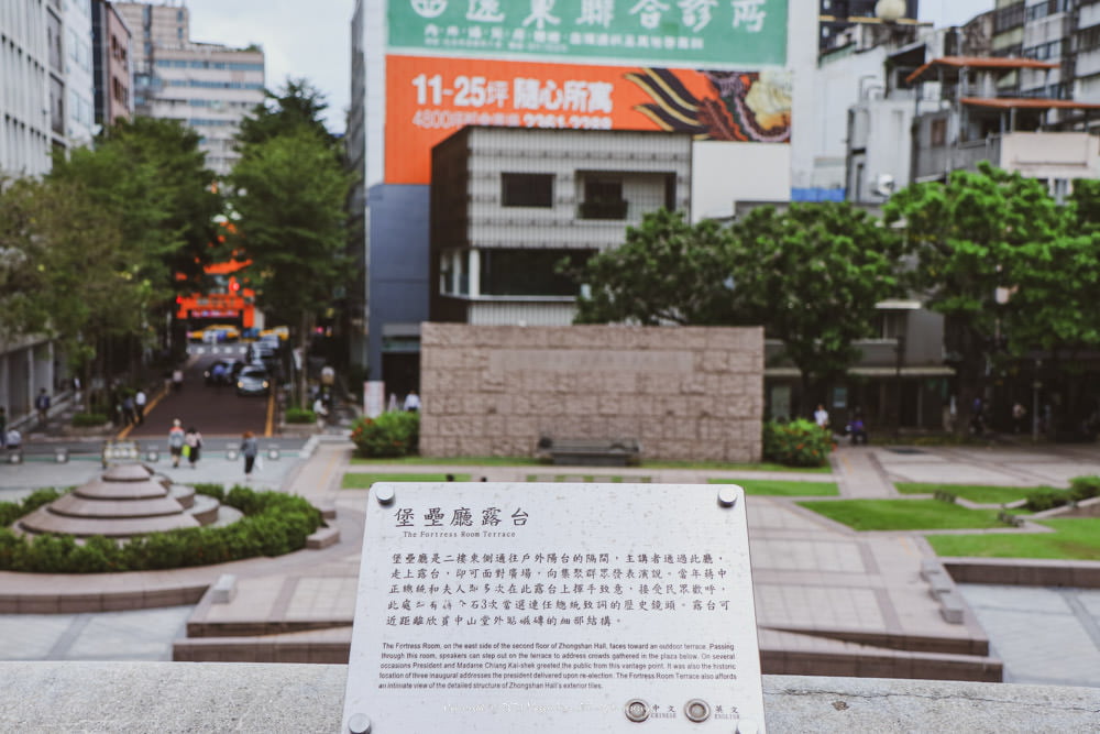 穿過堡壘廳會抵達戶外露台,那是當年向群眾廣場發表演講的位置,站在此處可掌握廣場的狀況。當年蔣中正總統及夫人曾多次在這裡揮手致意。位處博愛特區。
