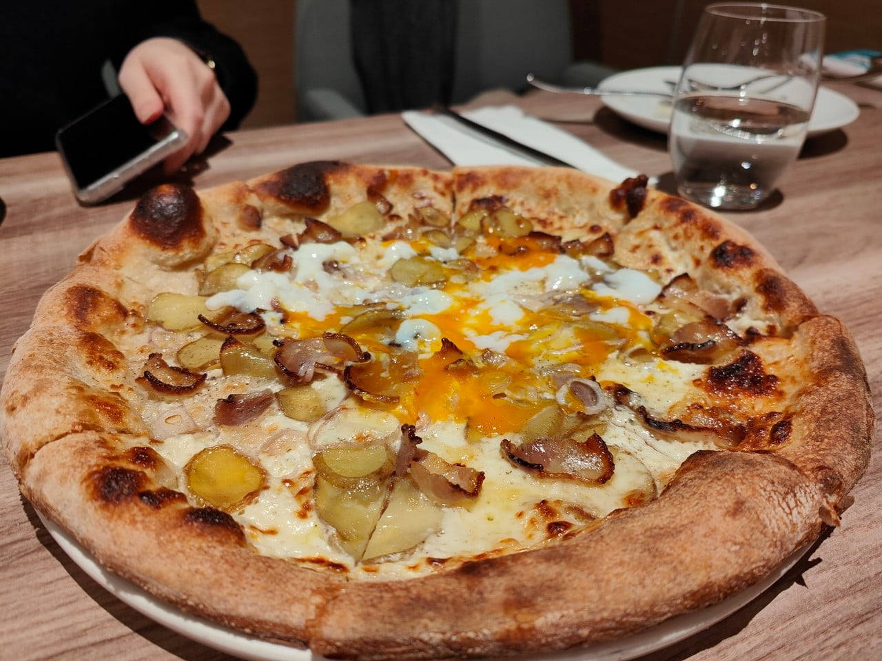 薄脆的餅皮上頭是馬鈴薯、培根、溫泉蛋等簡單配料,搭配再一起卻是好吃得不得了