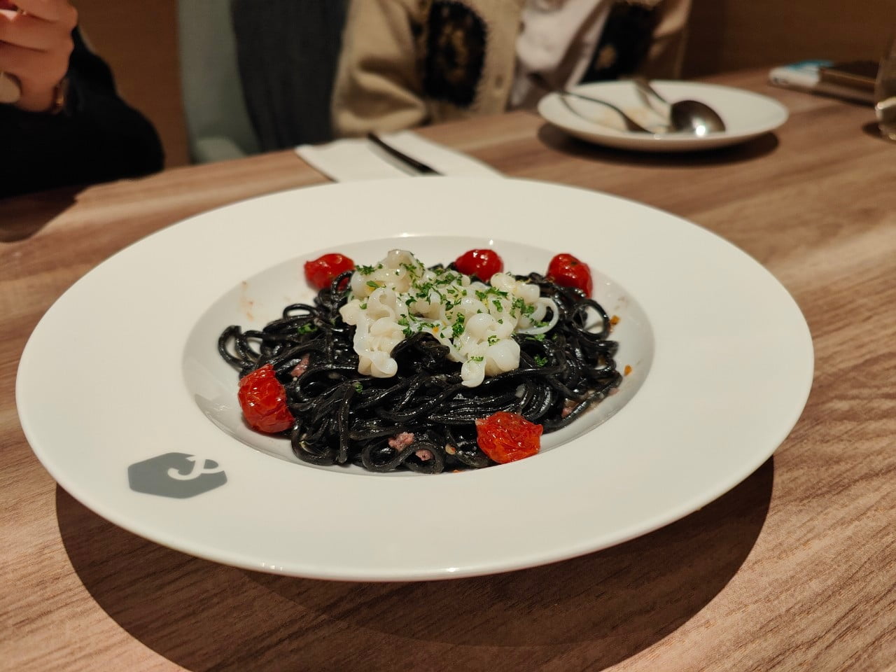 墨魚麵上放滿了嫩白的花枝薄片、番茄陪襯,