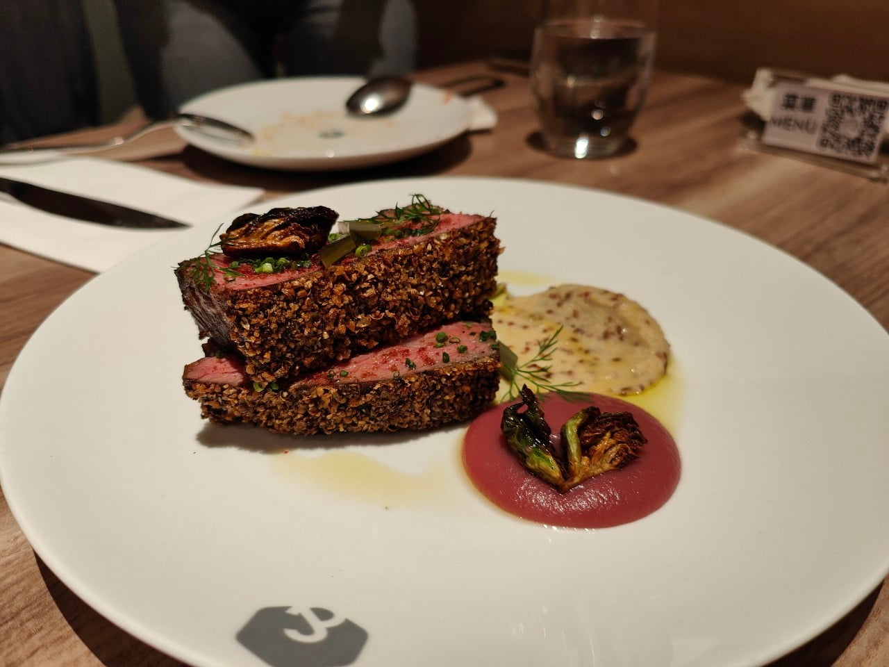 3大塊油脂香甜的牛小排口感太過癮了,佐以紫甘藍、煙燻麵包醬非常搭