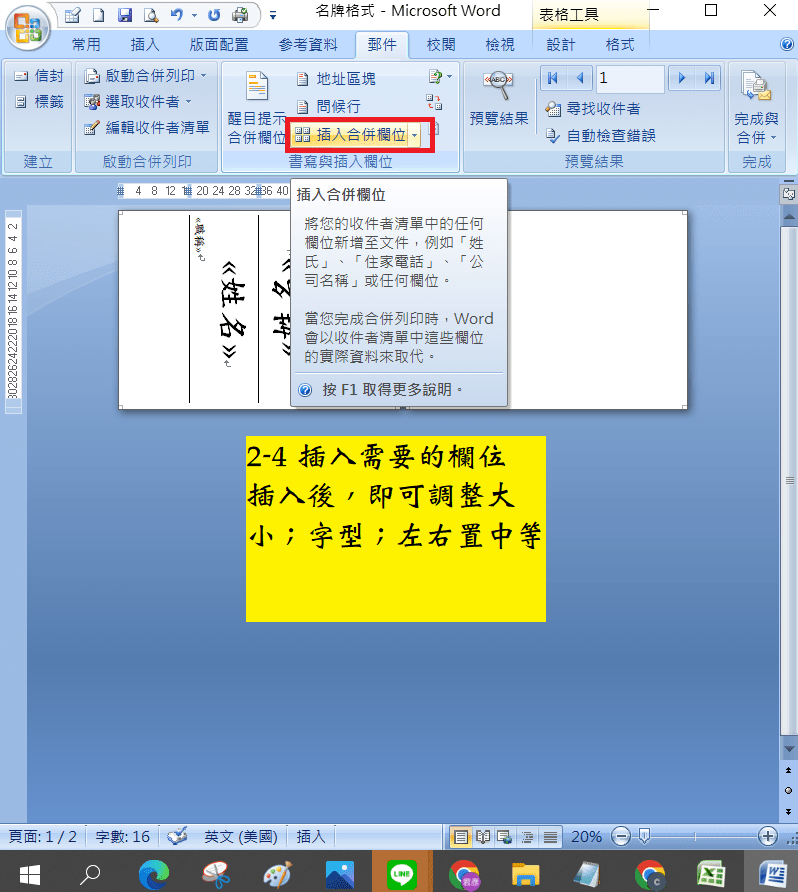 點選〔插入合併欄位〕,依照想要的方式插入姓名、職稱等,並在〔常用〕中設定文字大小、顏色等等。