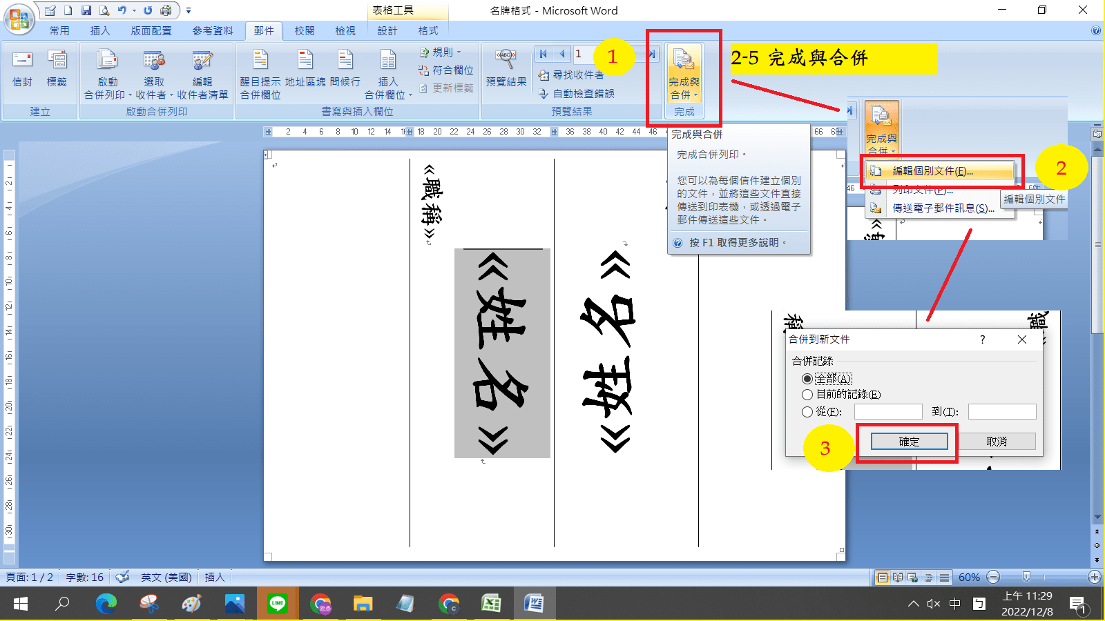 完成後,在〔郵件〕中的〔完成合併〕點選〔編輯個別文件〕。